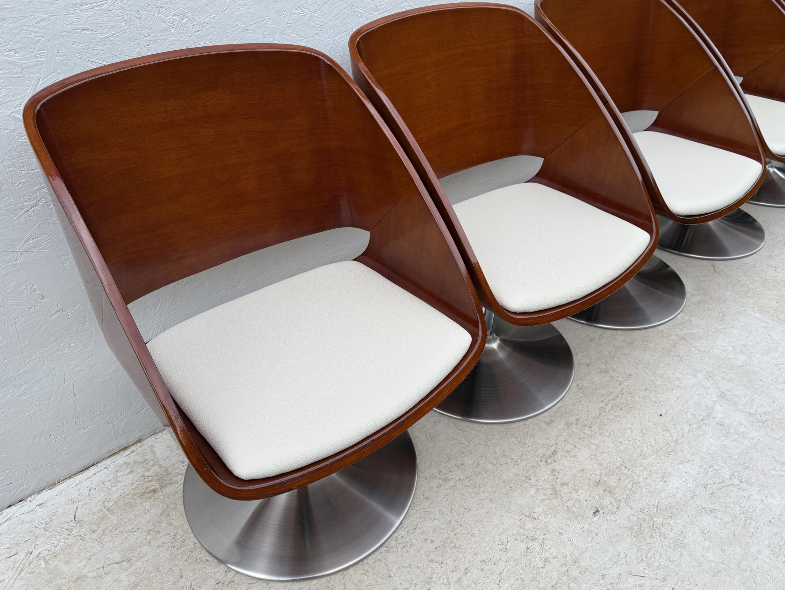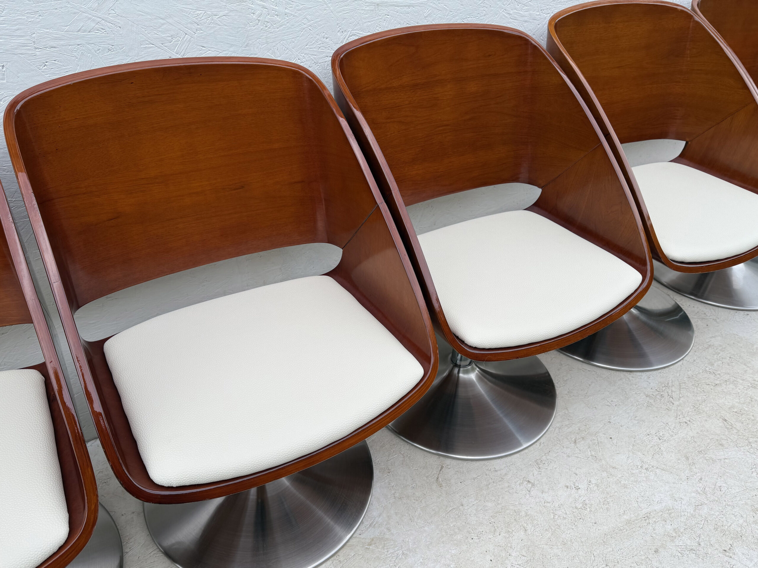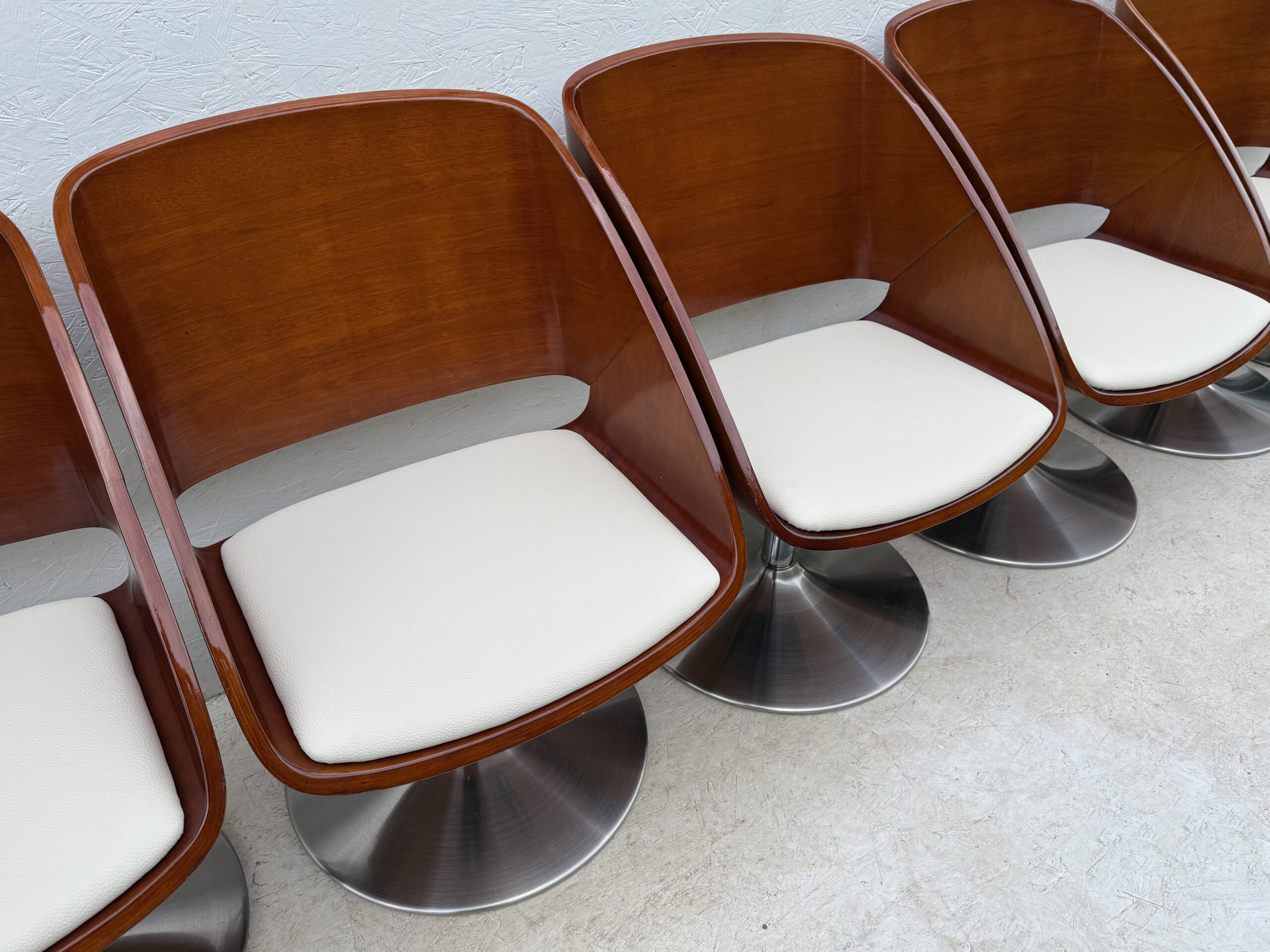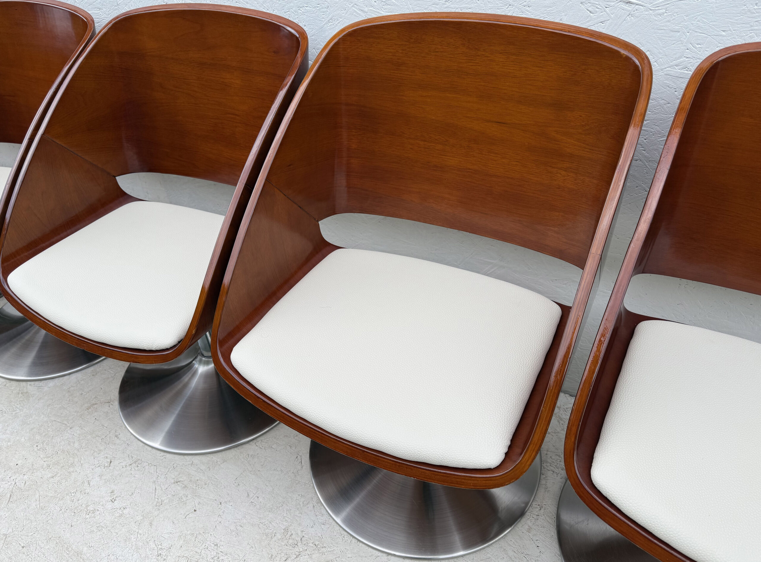 Each chair has been thoughtfully updated with newly upholstered seat pads, using fire-retardant foam and a soft, eco-friendly faux leather in a pale beige/off-white tone—adding a fresh, contemporary touch while preserving the vintage character. The chrome pedestal legs are equipped with a swing mechanism, allowing the seats to rotate for effortless movement and convenience at the dining table.