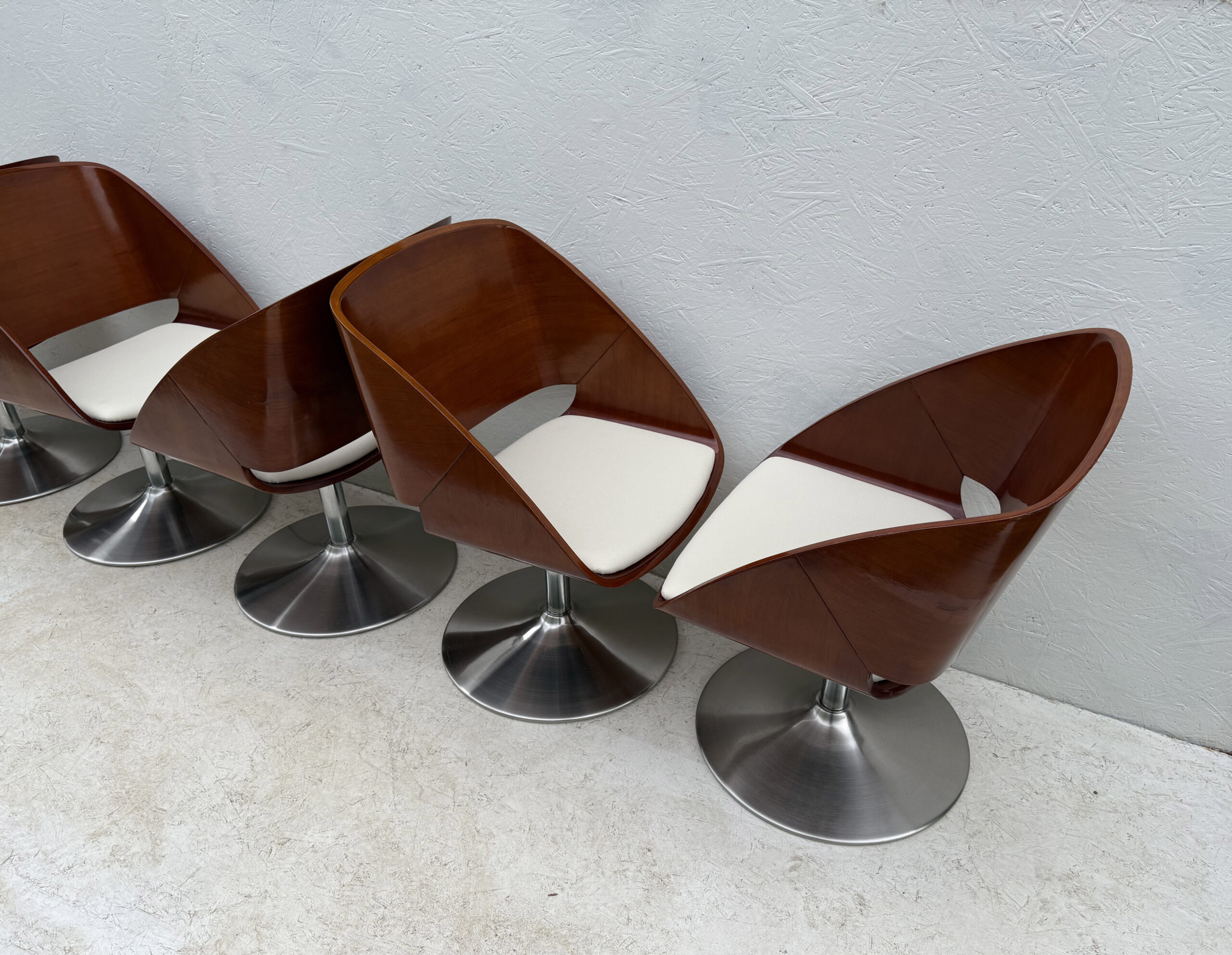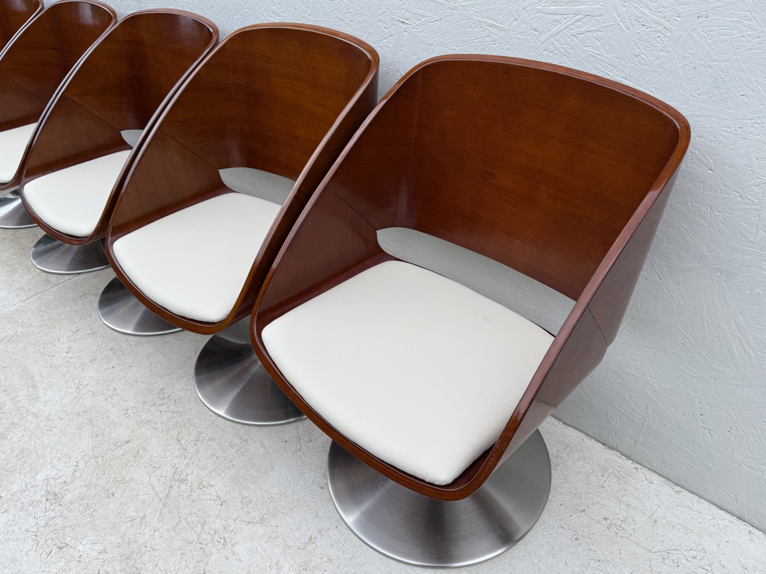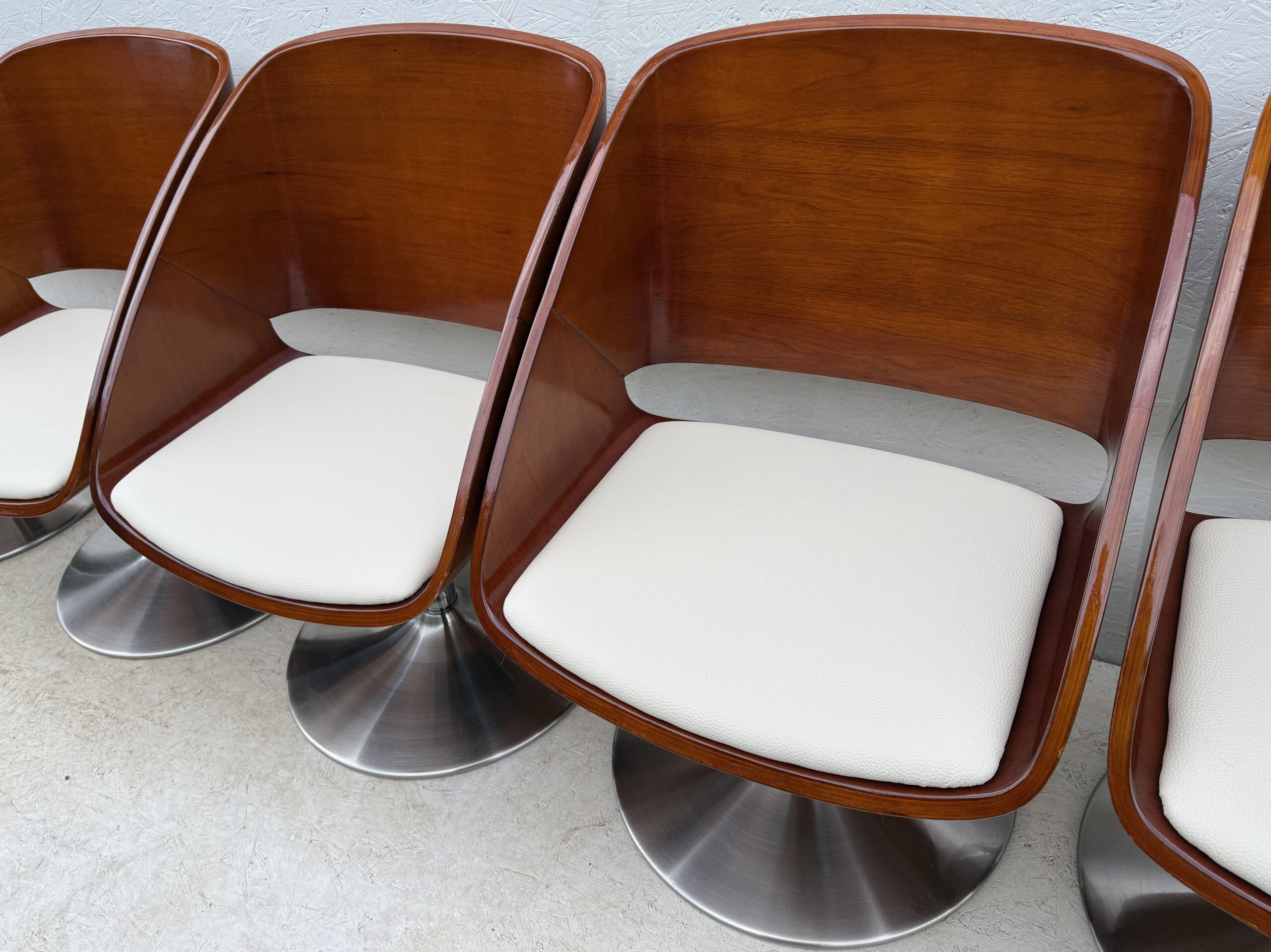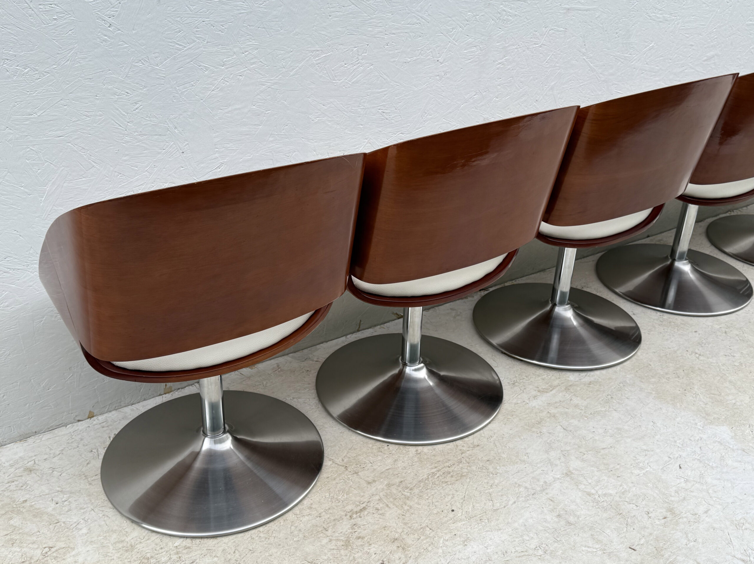 Each chair has been thoughtfully updated with newly upholstered seat pads, using fire-retardant foam and a soft, eco-friendly faux leather in a pale beige/off-white tone—adding a fresh, contemporary touch while preserving the vintage character. The chrome pedestal legs are equipped with a swing mechanism, allowing the seats to rotate for effortless movement and convenience at the dining table.