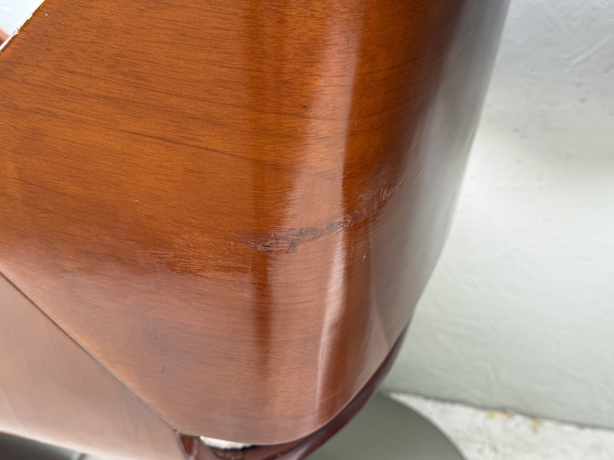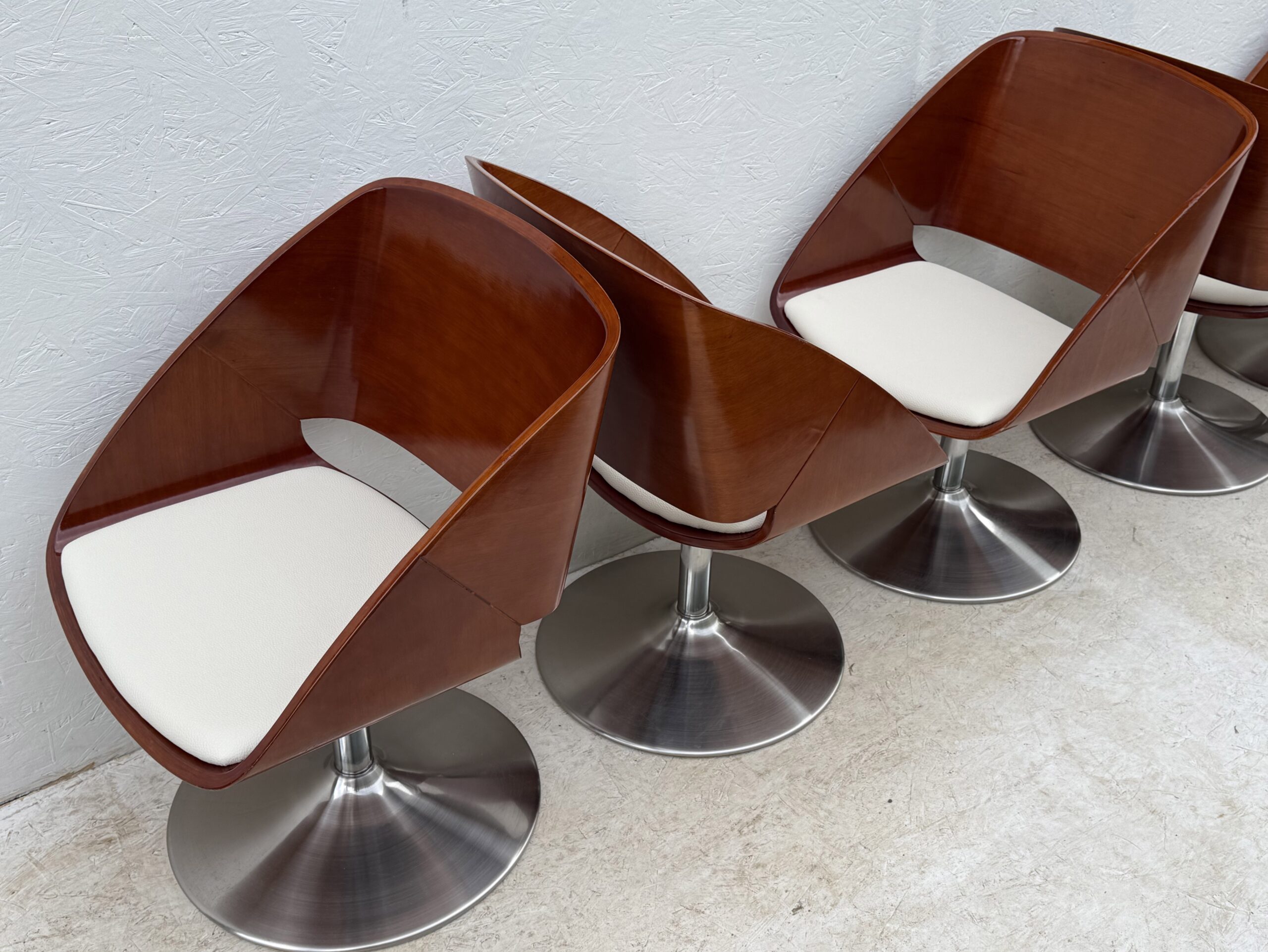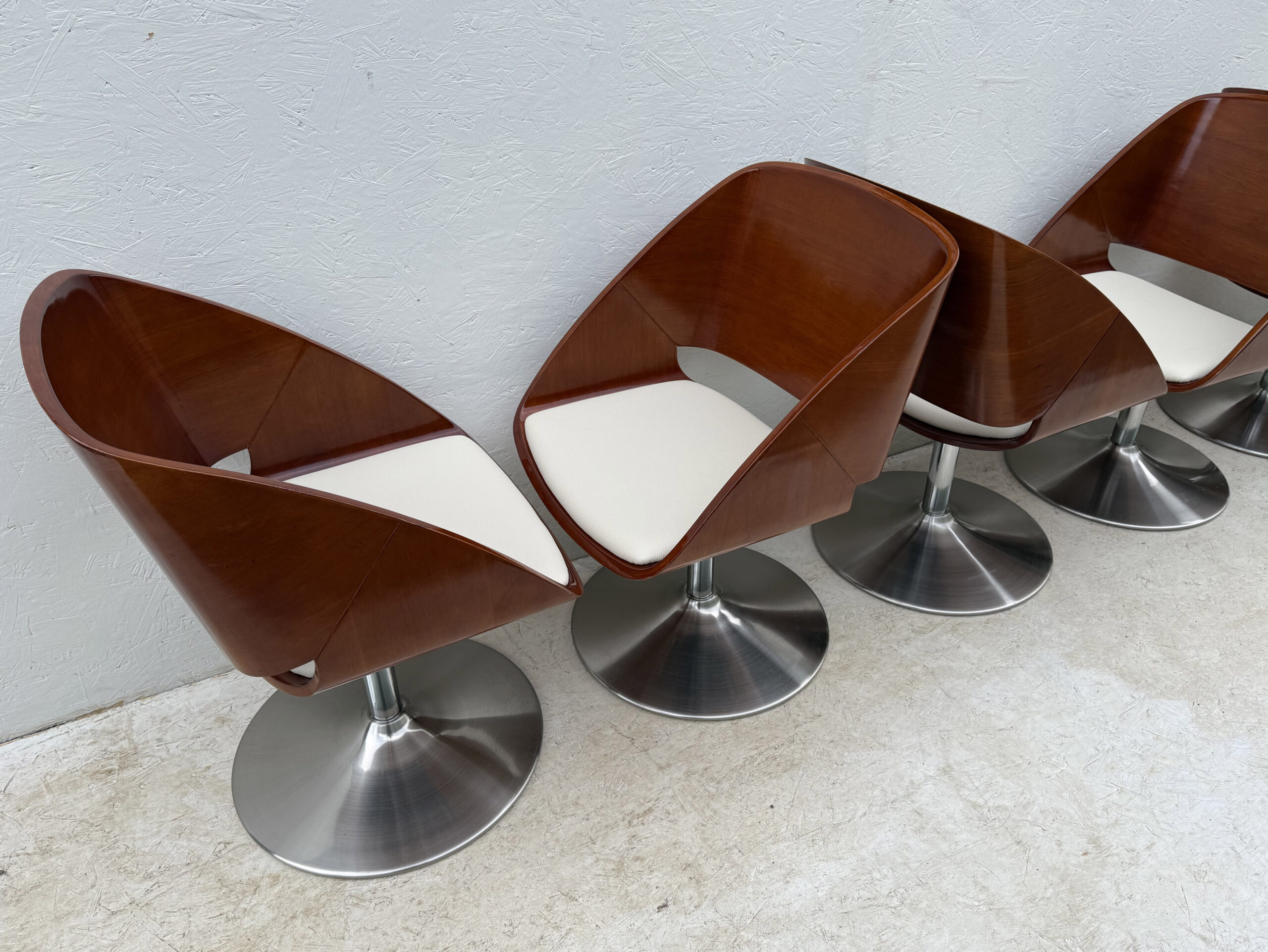 A stunning set of six vintage Plycraft dining chairs, crafted in the iconic style of George Mulhauser. These mid-century gems feature sculptural bent plywood shells that elegantly wrap around the body, offering both visual drama and ergonomic comfort. The rich, warm brown wood grain contrasts beautifully with the sleek chrome pedestal bases, creating a timeless blend of organic and industrial design.
