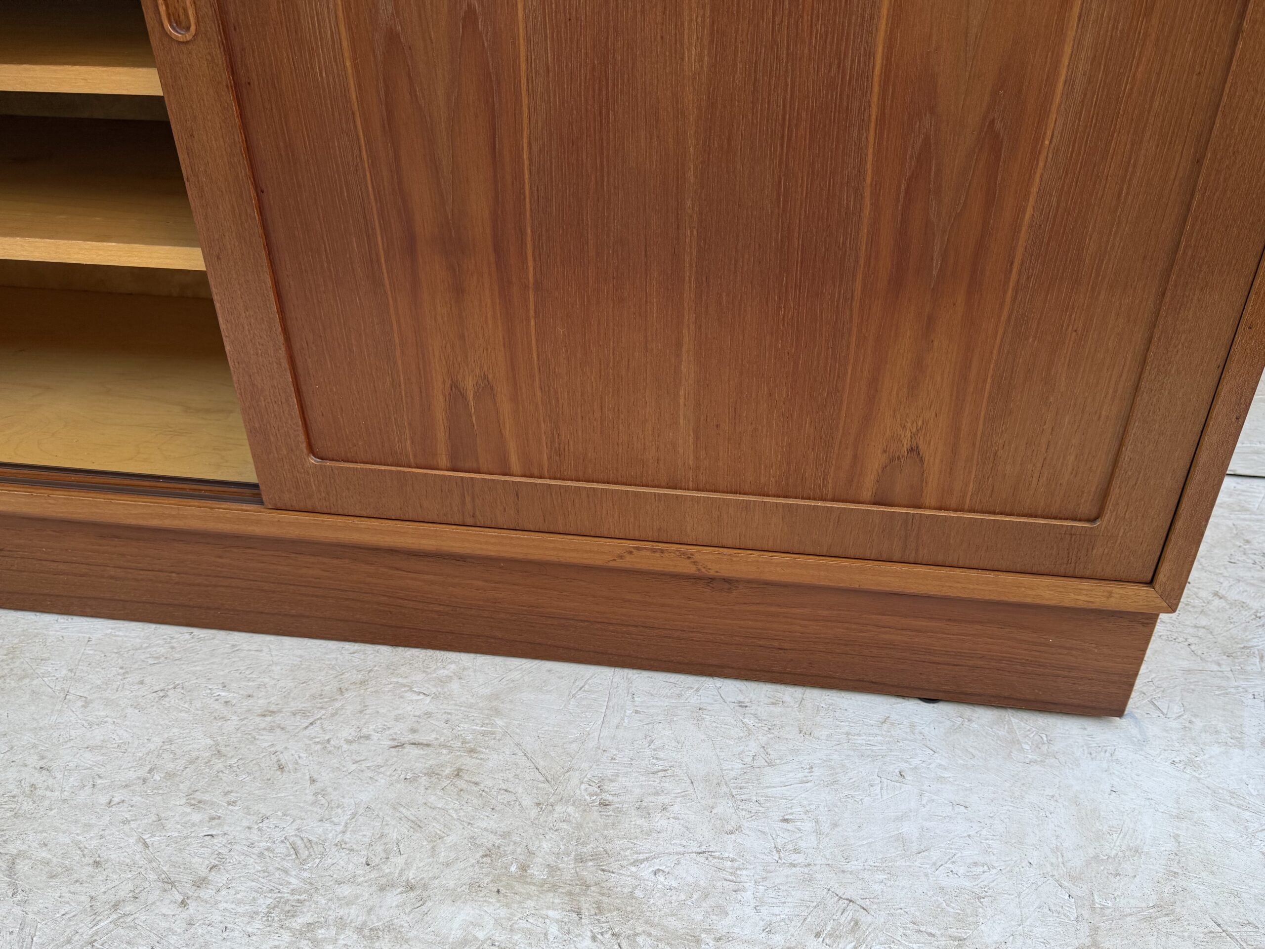 Crafted from warm, richly grained teak, the sideboard features sliding doors with beautifully inset handles that blend seamlessly into its minimalist facade. The piece rests gracefully on a plinth base, offering a grounded, architectural presence without the distraction of legs.