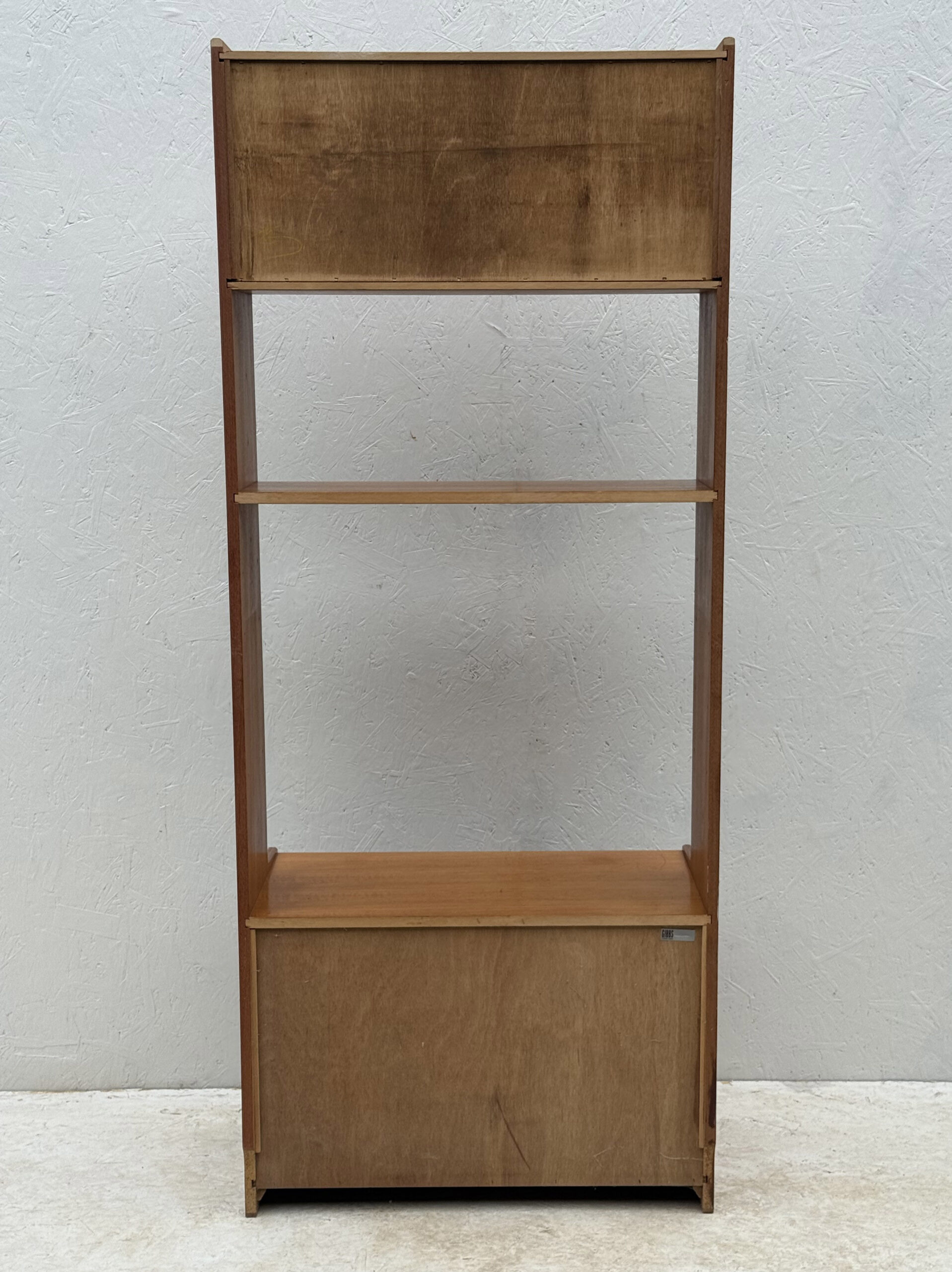 A beautifully proportioned freestanding wall unit by renowned British furniture maker Herbert E. Gibbs, this mid-century piece blends clean lines with practical elegance. Crafted in warm teak, it features a set of drawers at the base for concealed storage, and open-backed shelving above — ideal for displaying books, ceramics, or curated treasures, and an additional top cupboard with sliding doors .